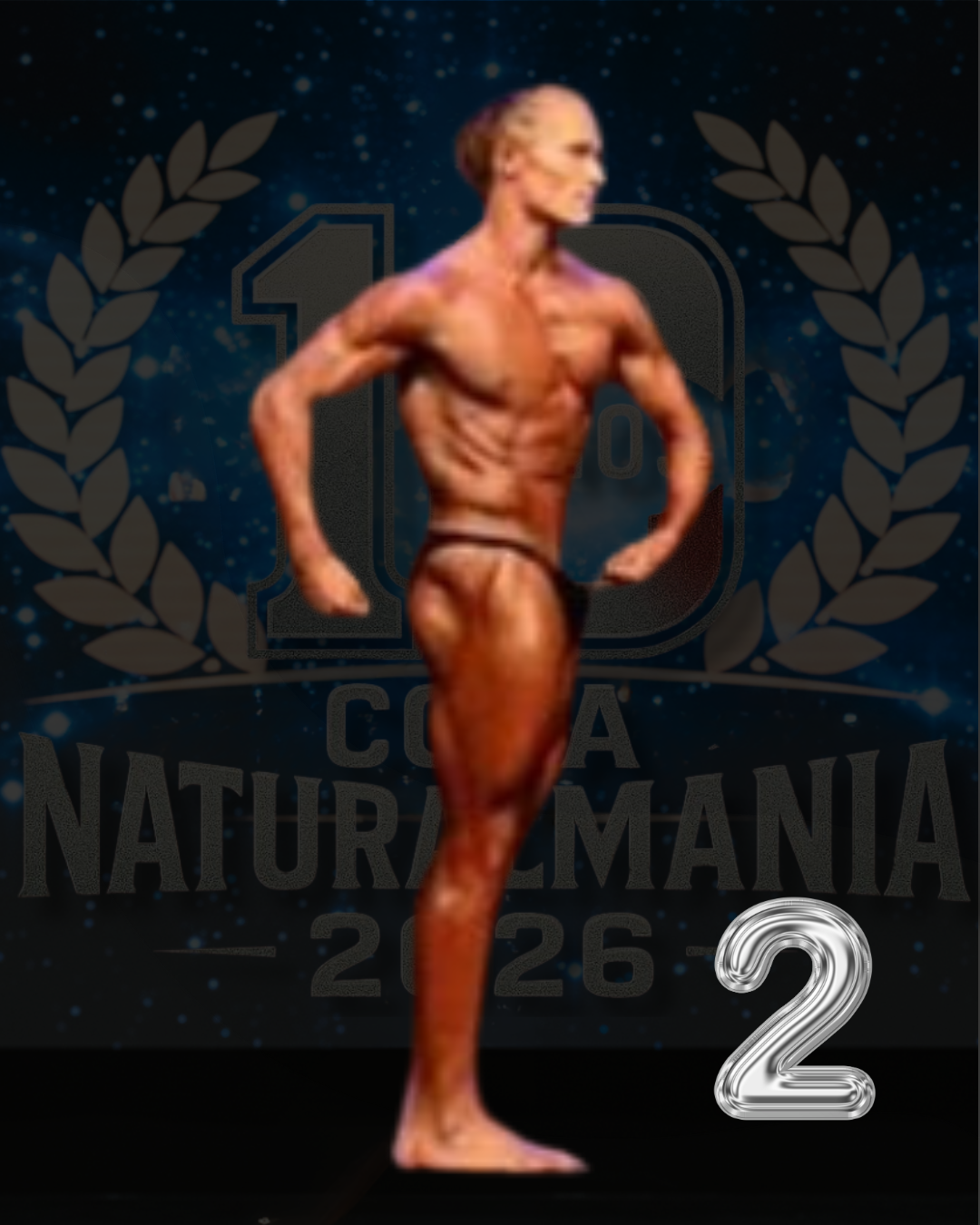 Brazos cerca del cuerpo, mostrando brazo, hombro y oblicuos, sin rigidez de culturismo “duro”.